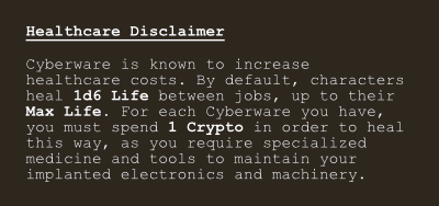 Cyberware is known to increase healthcare costs. By default, characters heal 1d6 Life between jobs, up to their Max Life. For each Cyberware you have, you must spend 1 Crypto in order to heal this way, as you require specialized medicine and tools to maintain your implanted electronics and machinery.